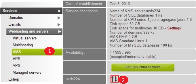 - Al menú, seleccioni el servei VMS(1) (Serveis/Webhosting i servidors/VMS) i en l'opció Descripció del servei faci clic a Configuració(2).