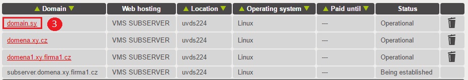 - A Visió general del servidor virtual es filtren només els creats en cada VMS per separat. Faci clic al hosting(3), on vol augmentar la quota de disc.