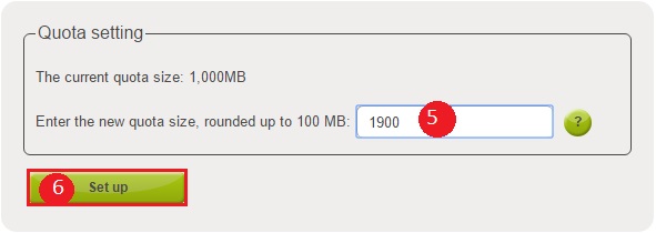 - Estableixi una nova mida de quota(5), sempre és en MB, el canvi ha de ser confirmat fent clic al botó Establir(6). Els canvis seran visibles en uns 10 minuts, durant el canvi no és possible realitzar cap altre canvi en el servidor.