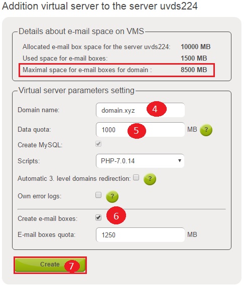 - Introdueixi el nom del domini(4) per al nou webhosting i estableixi la quota per a les dades(5). També pot crear bústies de correu(6), o les pot crear més endavant en l'administració de bústies. La quota assignada es redueix del l'espai total disponible al VMS. Confirmi fent clic a Crear(7).