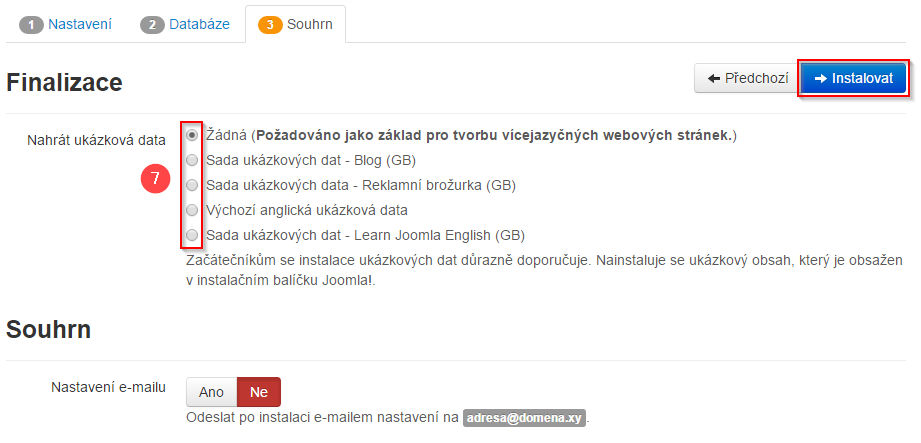 - Pokud jste všechny údaje vyplnili správně, zobrazí se Souhrn údajů, zde můžete provést úpravy v nastavení - doporučujeme nahrát ukázková data (7), která průběžně můžete upravovat podle vlastních potřeb. Pokud všechny údaje souhlasí, můžete pokračovat kliknutím na tlačítko Instalovat.