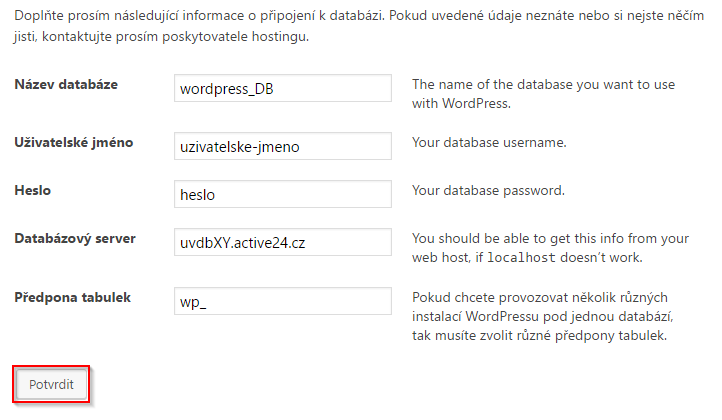 - Pomocí webového prohlížeče navštivte doménu včetně cesty ke složce, na které se má Wordpress instalovat (např. domena.xy/cilovaslozka), případně můžete použít alternativní adresu serveru (ve tvaru domena.xy.uvirtXY.active24.cz/cilovaslozka) - naleznete ji v Detailu virtuálního serveru po přihlášení do Zákaznického centra (Servery a hosting / Přehled serverů / Detail).