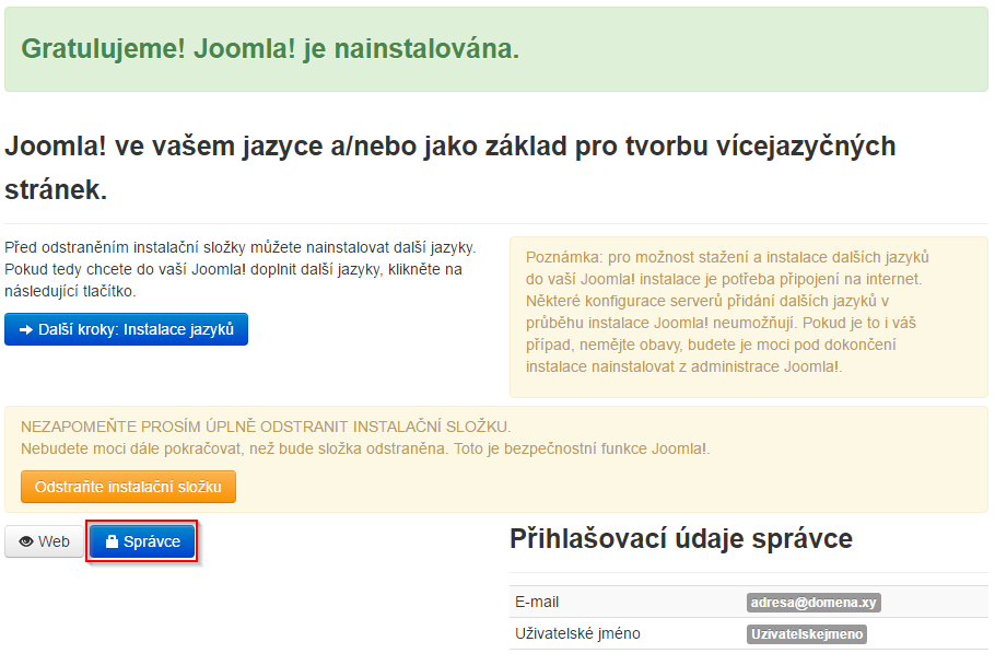 - Joomlu můžete začít ihned používat. Stačí se přihlásit do administrace kliknutím na Správce. Jako správce (administrátor) se můžete kdykoliv přihlásit přes adresu vaseomena.xy/administrator.
