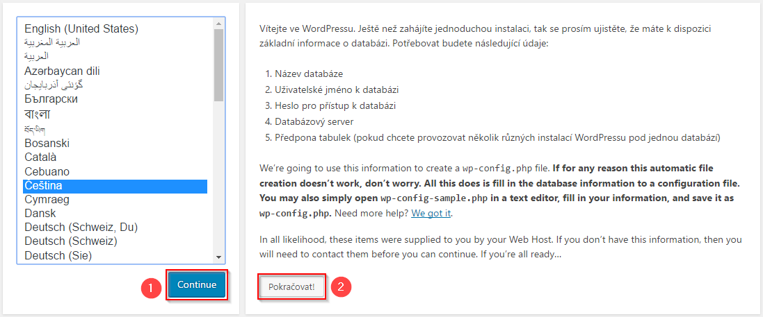 - Zobrazí se výběr jazykové verze Wordpressu. Označte preferovaný jazyk a klikněte na Continue (1). V dalším kroku průvodce ověřuje, zda máte přichystané přihlašovací údaje k MySQL databázi, stačí tedy Pokračovat (2) dále.