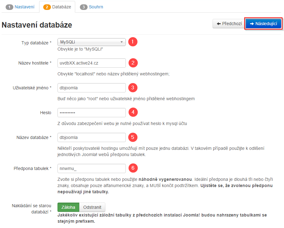 - Vyberte typ databáze, můžete nechat výchozí výběr MySQLi (1). Vyplňte přístupy k databázi (2 – 5), zaslali jsme vám je při vytvoření virtuálního serveru na kontaktní email. Pokud je nemáte, můžete přihlašovací údaje k databázi zjistit v Zákaznickém centru (Služby / Hosting a servery / Virtuální servery). Předponu tabulek opět nechejte výchozí (6). Po vyplnění potřebných údajů klikněte na Následující.