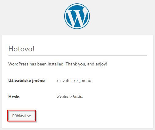 - A je hotovo. Nyní se můžete Přihlásit údaji které jste si nastavili v předchozím kroku instalace. Přihlášení můžete provádět vždy z adresy domena.xy/cilovaslozka/wp-login.