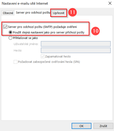 - Gehen Sie zum Reiter Postausgangsserver, setzen Sie ein Häkchen beim Der Postausgangsserver (SMTP) erfordert Authentifizierung (10) und wählen Sie den Menüpunkt Gleiche Einstellungen wie für Posteingangsserver verwenden (10), gehen Sie anschließend zum letzten Reiter Erweiterte Einstellungen (11).