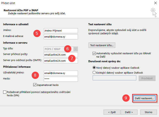 - Tragen Sie die Benutzeranmeldeinformationen (5) ein, wählen Sie den Kontotyp (6) - POP3 oder IMAP aus, tragen Sie den Eingangs-und Ausgangsserver email.active24.com (7) ein, geben Sie die Anmeldedaten für das Postfach (8) ein. Falls Sie das Postfach-Passwort nicht kennen, setzen Sie es im Kundencenter neu (nach dieser Anleitung). Klicken Sie anschließend auf Weitere Einstellungen (9).