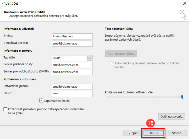 - Tragen Sie Ihre Benutzer-, Server- und Anmeldeinformationen ein. Der Eingangs-und Ausgangsserver für POP3 und IMAP ist email.active24.com.