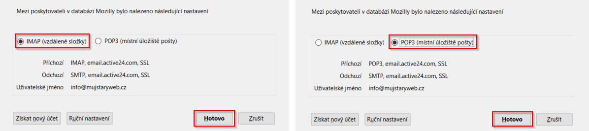 - Thunderbird erkennt unsere Mailserver automatisch. Geben Sie an, ob Sie das Postfach als IMAP oder POP3 Konto anlegen möchten und klicken Sie auf Fertig stellen. Falls die automatische Servererkennung fehlschlägt, können Sie die manuelle Einstellungsmöglichkeit nutzen.