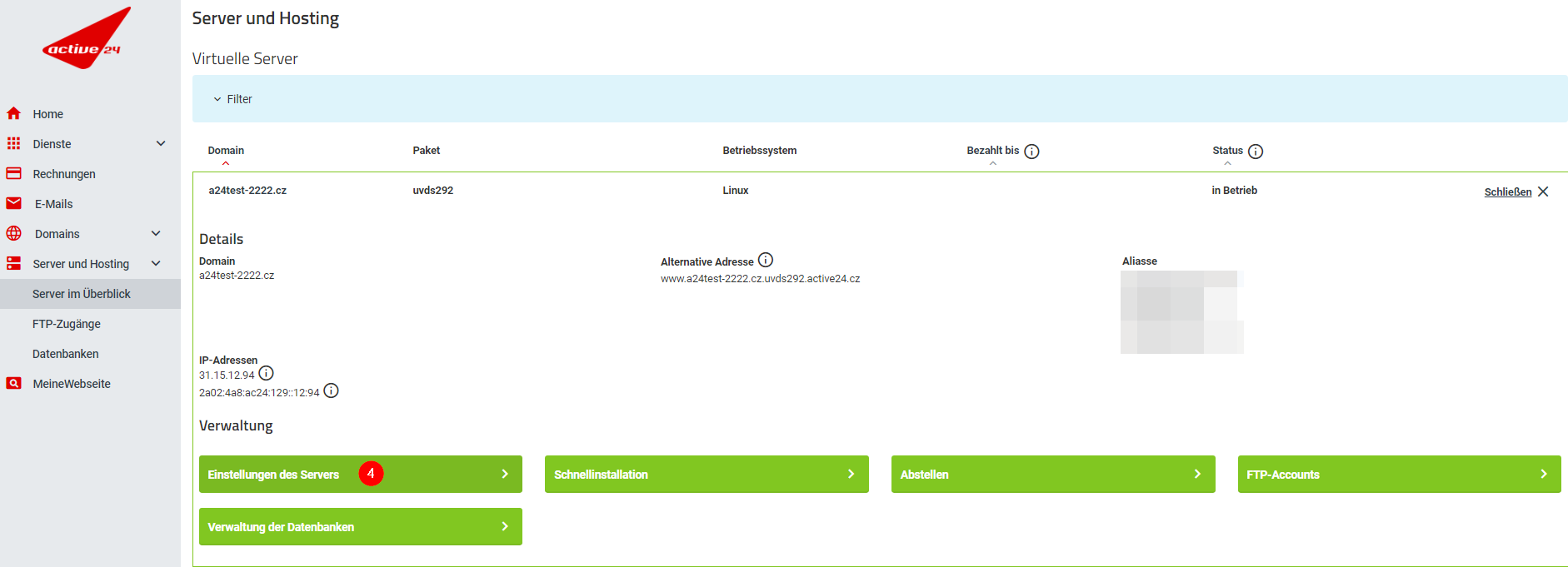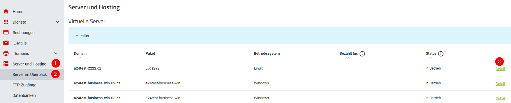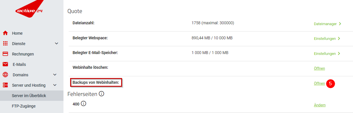 - Gehen Sie zu Einstellungen Ihres Hostings, bei dem Sie die Daten wiederherstellen möchten (Server und Hosting » Server im Überblick » Detailseite öffnen ).