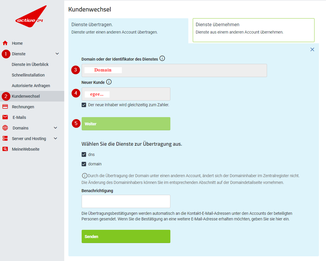 Die Änderung des Accountbesitzers (Kunden) und des Zahlers bestimmter Dienstleistungen wird nur in der Kundendatenbank von ACTIVE 24 durchgeführt. Bei der Übertragung der Domain zwischen den Accounts kommt es zu keiner Datenänderung im zentralen Domainregister (WHOIS).