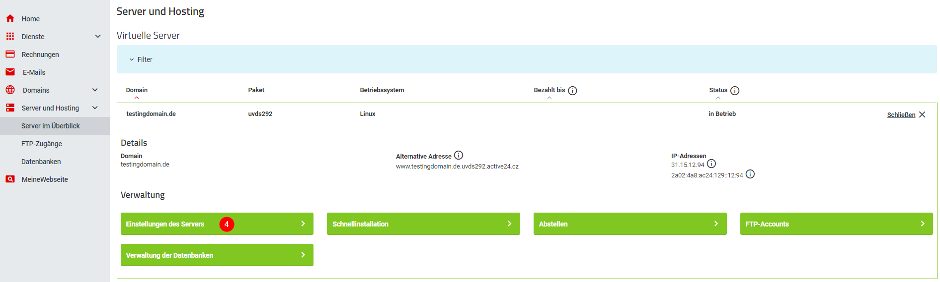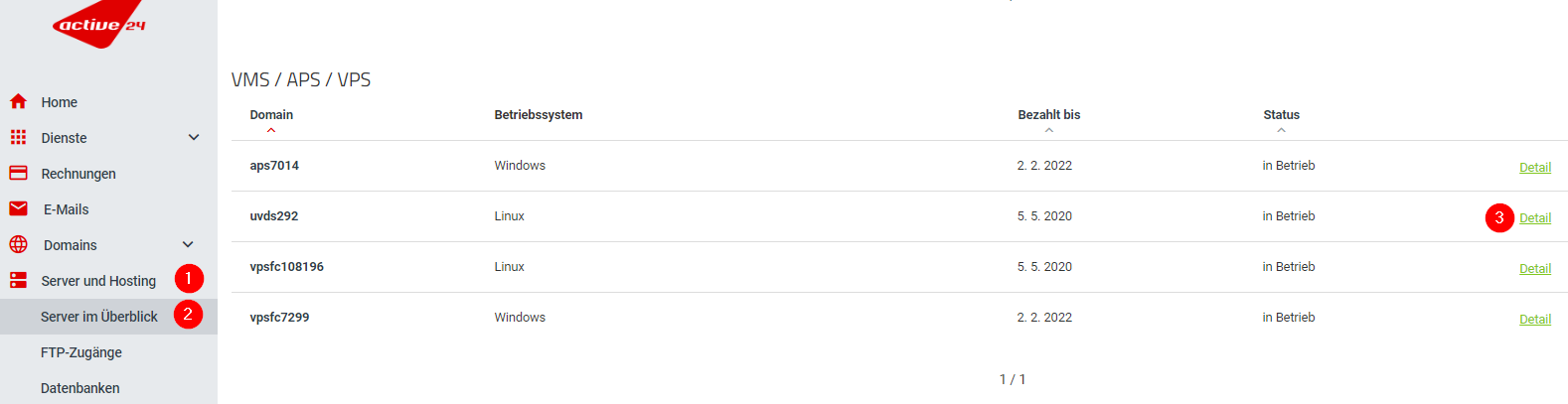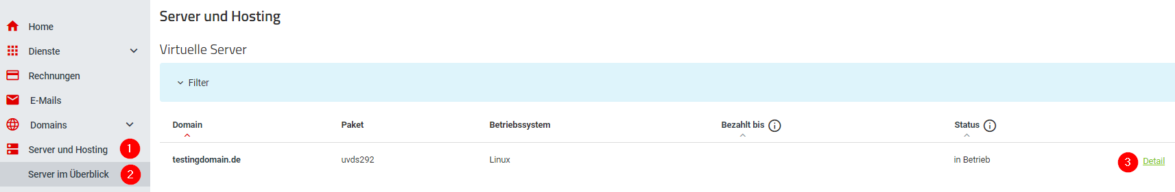 - Gehen Sie zur Server-Übersicht und wählen Sie den Server, dessen Speicherquote Sie erhöhen möchten (Server und Hosting / Server im Überblick / Detailseite des benötigten Servers öffnen).