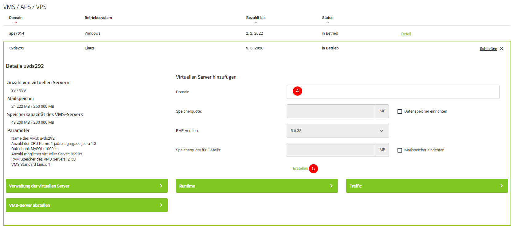 - Geben Sie die Domain (4) des neuen virtuellen Servers an und legen Sie die Speicherquote für Ihre Daten fest. Die zugeordneten Speicherquoten werden vom Gesamtspeicher des VMS abgezogen. Bestätigen Sie alle Einstellungen mit dem Klick auf Erstellen (5).