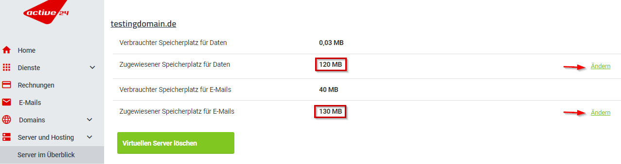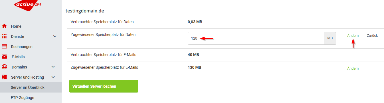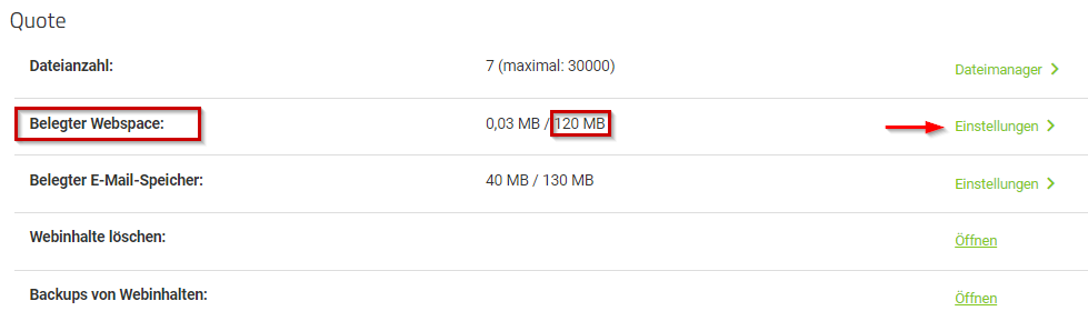 Änderung der Speicherquote des Webhostings