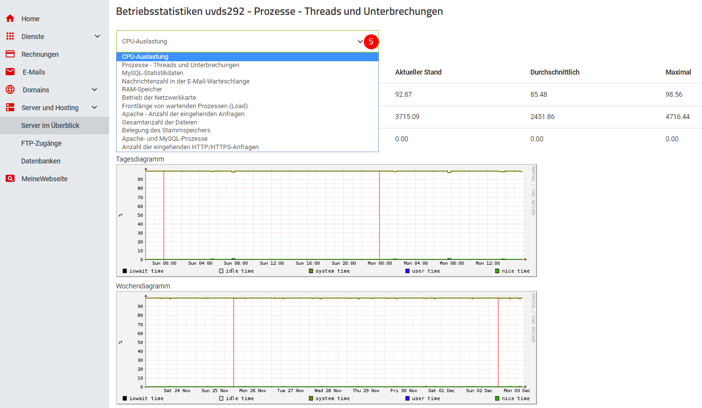 Die wichtigsten Daten über die Auslastung des Servers werden in Diagrammen festgehalten. Den direkten Zugriff auf die Auslastungsdiagramme finden Sie im Kundencenter. Anhand dieser Statistiken lässt sich erkennen, ob das verwendete VMS-Paket Ihren Anforderungen entspricht oder, ob ein Teil der Webanwendungen unzureichend optimiert ist.