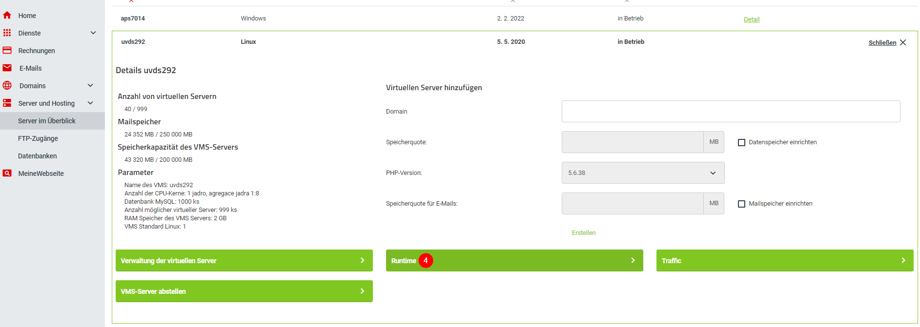 - Gehen Sie zur VMS-Übersicht und wählen Sie, unter welchem VMS Sie einen neuen virtuellen Server anlegen möchten (Server und Hosting / Server im Überblick / Detailseite des benötigten VMS öffnen).