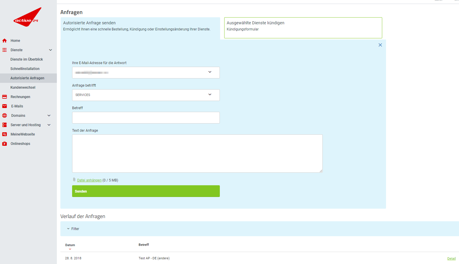Die Möglichkeit, eine autorisierte Anfrage zu schreiben und zu senden, einschließlich der Einsicht aller bisherigen Anfragen, finden Sie in der rechten, oberen Menüleiste im Kundencenter (Anfragen). Oder verwenden Sie dafür den Link auf der Überblickseite der Dienste oder direkt im Hauptmenü.