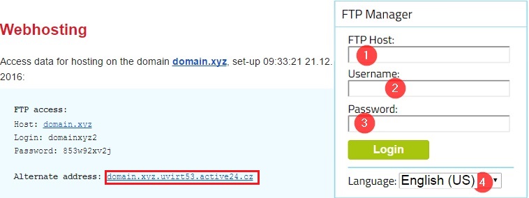 - On address webftp.active24.com you can find out easily manageable web FTP Manager. To log in you need to know domain, for which the hosting is created for, username and password for FTP.
