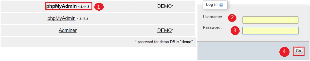- When you have archive of backup ready in your local PC, log in to MySQL administration(1). Fill out username(2)and password(3)- log in by clicking Go(4). Login information were send on your contact e-mail, when the database was created, or you can ask for a new password.
