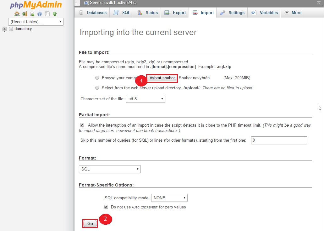 - Choose file (1), that has to be imported, upload of backup will start after clicking on Go((2).