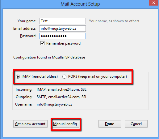- Mozilla Thunderbird should automatically find our mail servers. You just have to choose if you want to use POP3 or IMAP. By clicking Done you will add a mailbox to your e-mail client. In case the servers are not recognized automatically, use Manual settings.