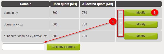 - Bij E-mail ruimte instellen op de server kunt u meer domeinen (3) kiezen en de Toegewezen quota veranderen bij collectieve instelling of op aparte domeinen, klik op de button Bewerk(4) en verander de hoogte.