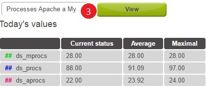 Proces Apache en MySQL: vergelijken van processen die worden uitgevoerd tussen de webserver en de database Gebruik van de root schijf: gebruik van de gekochte diskruimte Verkeer op de netwerkkaart: controleert het dataverkeer Inode-count: aantal van aangemaakte bestanden en mappen op de server Lengte van de wachtrij: meet de snelheid van de uitvoering van alle processen Mail-wachtrij: aantal uitgevoerde emails per server number Memory2: controleert het gebruik van het geheugen(RAM) Mysql Statistieken: berekent de snelheid en het aantal database transacties op de server (MySQL) Nginx-aanvragen: statistieken van voltooide processen vanaf de start van de server Processor gebruik: CPU server gebruik Web hits 3: acties gemaakt door bezoekers van de website