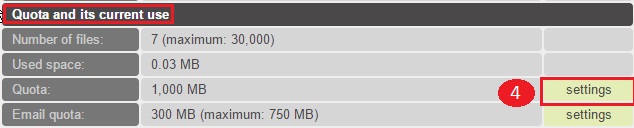 - In de categorie Quota en het huidige gebruik,ga naar de optie Quota en klik op Instellingen(4).