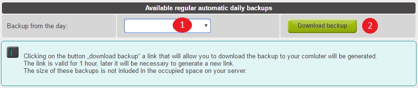 - In de categorie; Beschikbaar regelmatige automatische dagelijkse backups kunt U een Backup kiezen van een specifieke dag (1). De Backup kan gedownload worden naar uw PC door te klikken op ; Download backup (2).