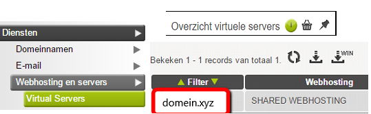 - Kies op de domeinnaam, waar U de Database voor gecreeërd wenst te hebben.(Diensten/webhosting en servers/Virtual servers)