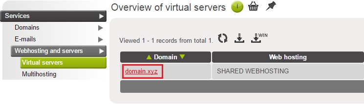 - Klik op de domeinnaam waarbij u de database wilt creëren (Diensten/webhosting en servers/Virtual servers).
